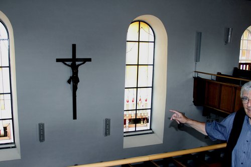 Der frühere Monakamer Pfarrer Karl Sutor erklärt die Bedeutung der Fenster für die Kirche in dem Bad Liebenzeller Teilort.