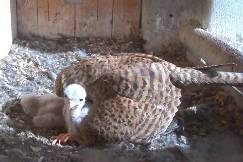 Zwei der drei Falkenküken im Turm der St. Georgskirche in Dettingen unter Teck - liebevoll umsorgt vom Muttertier.